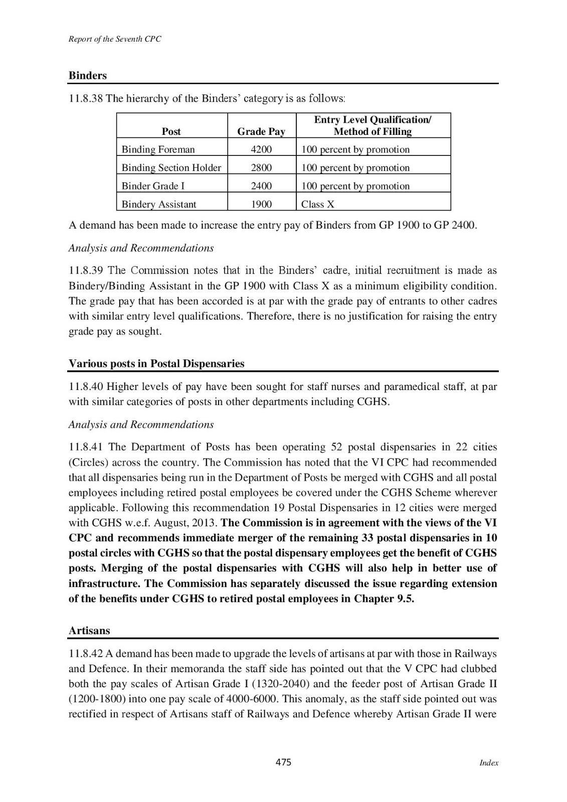 The Commission is of the view that there is no justification for enhancement of minimum educational qualifications for Direct Recruits for Postal Assistants/Sorting Assistants from Class XII to Graduation and the entry grade pay from GP 2400 to GP 2800. No justification for upgrading LSG, HSG-II & HSG-I (Para 11.8.23 & 11.8.24)